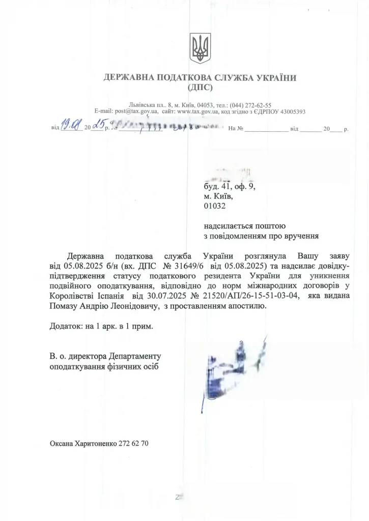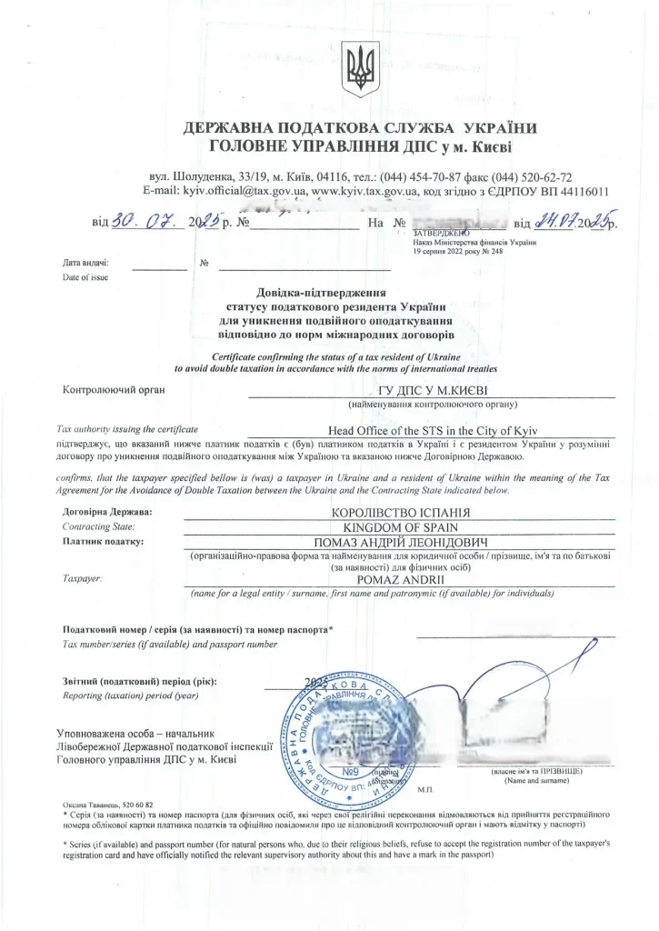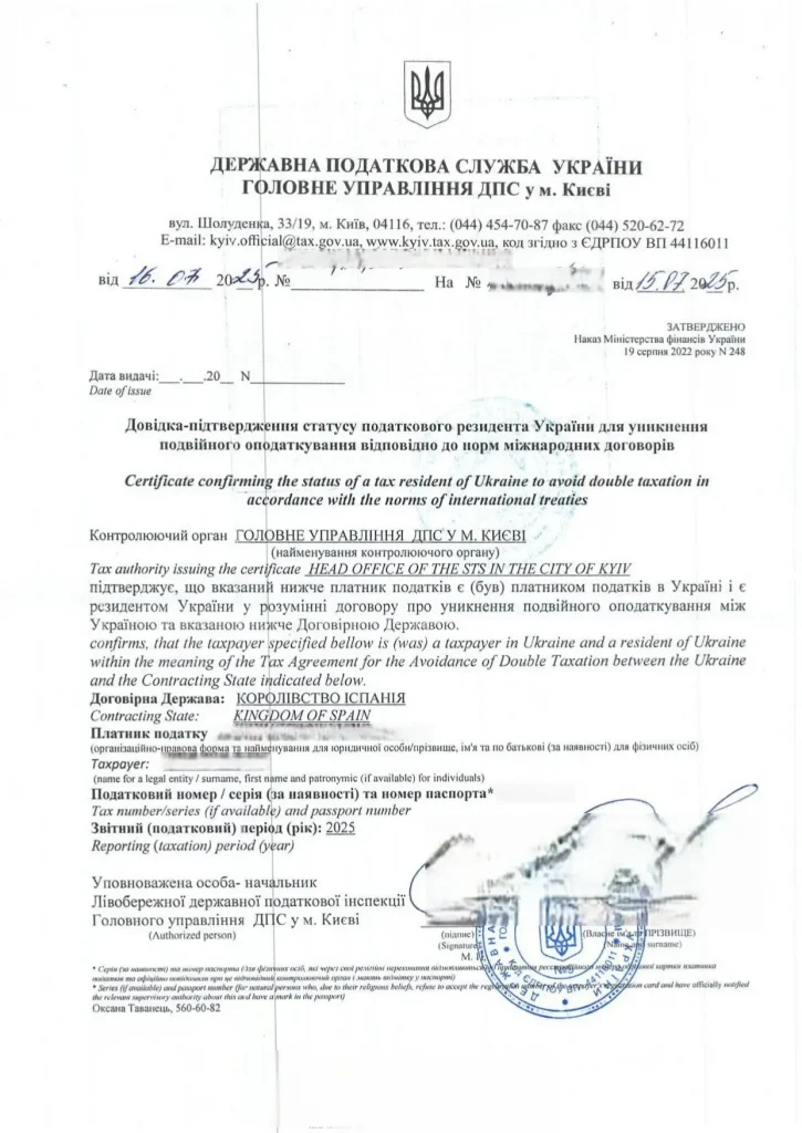 Видачею довідки займається Державна податкова служба України (ДПС). У документі офіційно фіксуються ваші дані (ПІБ, ІПН), період резидентства та підтвердження того, що ви є платником податків в Україні.