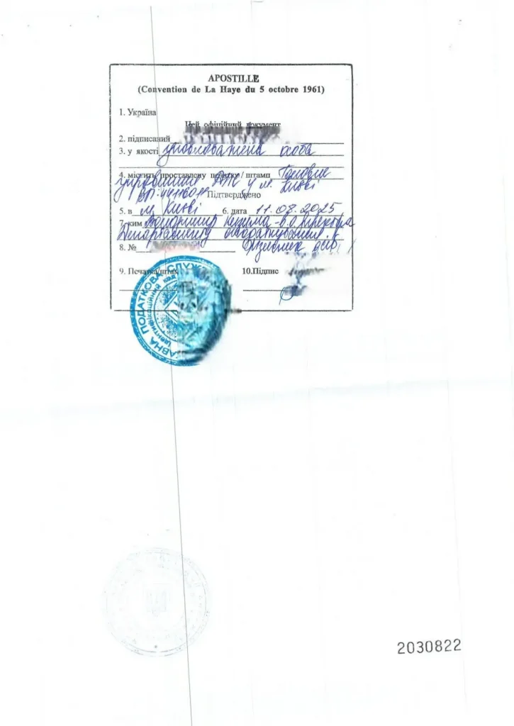 Це найпоширеніший варіант. Апостиль – це спеціальний штамп, який підтверджує, що документ є офіційним і дійсним. Він потрібен для більшості країн Європи (Польща, Німеччина, Іспанія, Італія тощо), а також для США, Канади та Великої Британії.