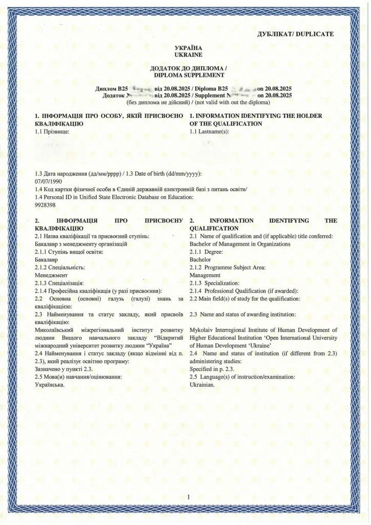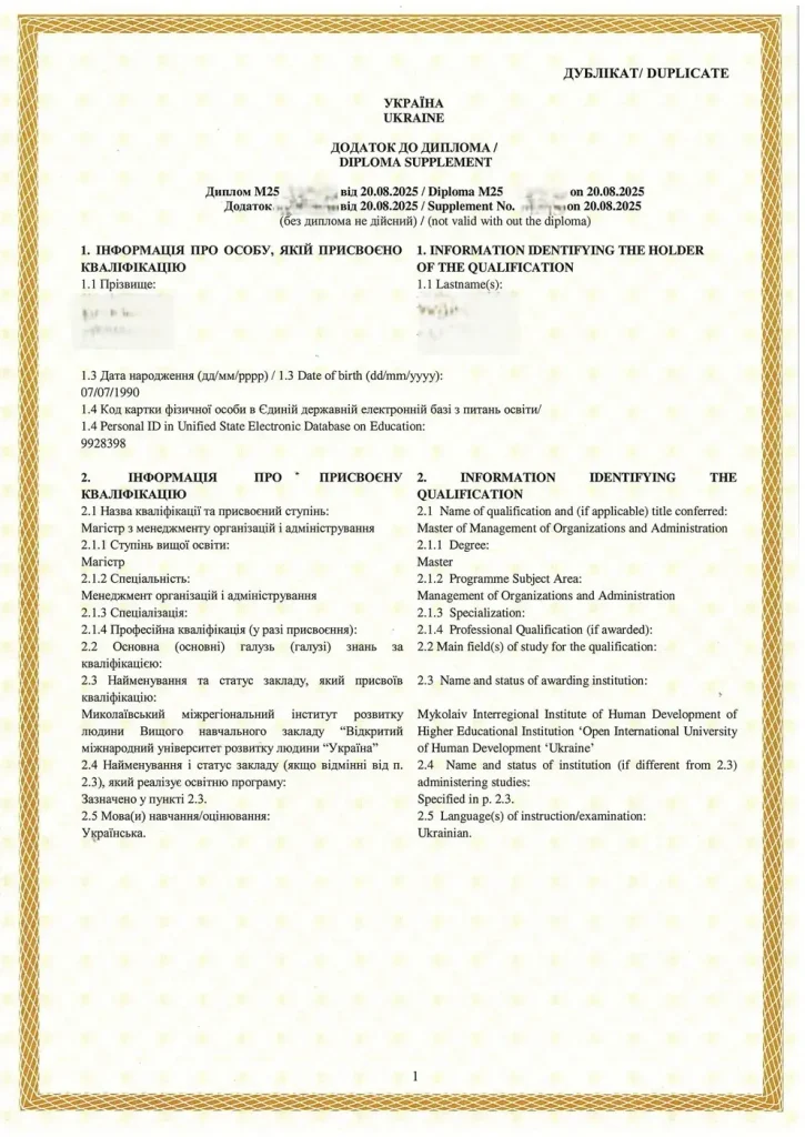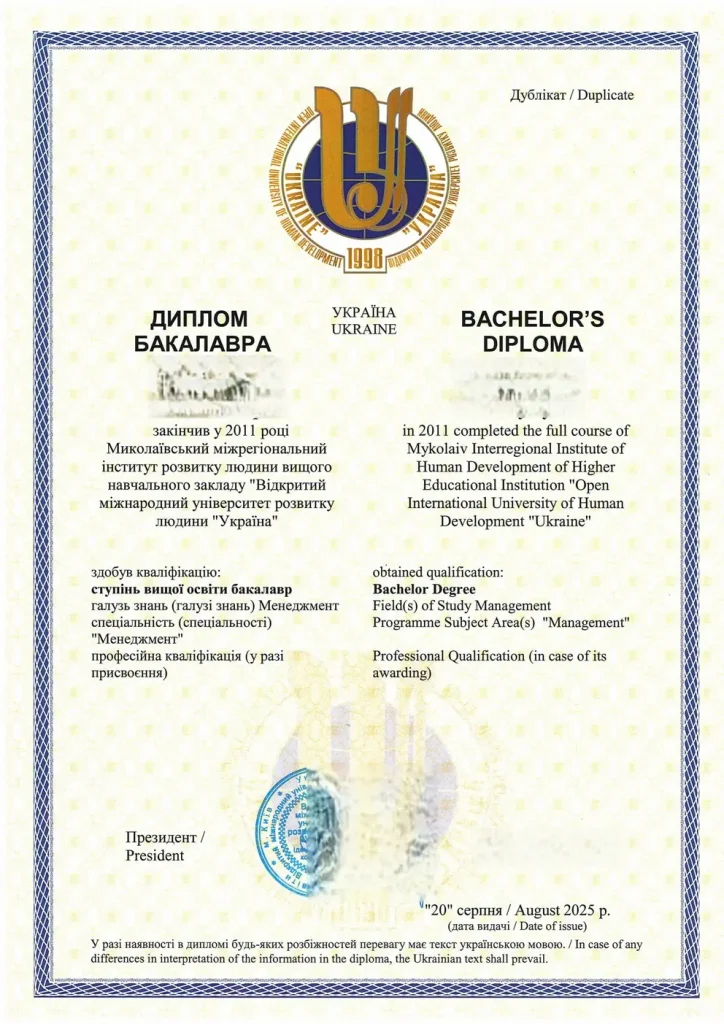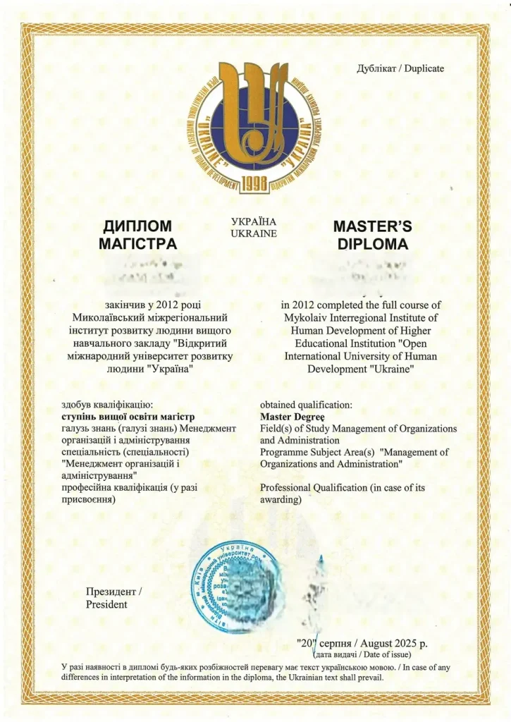 - Мова: Основна – українська. У сучасних дипломах або міжнародних програмах часто видають двомовні варіанти (укр/англ).